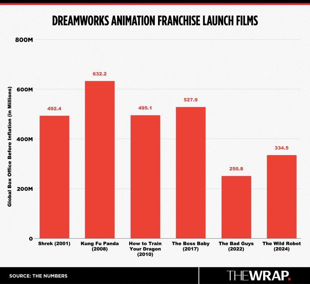 DreamWorks’ box office record reflects this. “The Bad Guys” and “The Wild Robot” made less at the box office, even before inflation adjustment, than pre-pandemic franchise launchers like “Shrek,” “How to Train Your Dragon” and “The Boss Baby.” Granted, those two new films, unlike “Boss Baby” or “Dragon,” were produced on budgets below $100 million, a trend that should continue as DreamWorks is set to increase their use of overseas animation vendors in production.