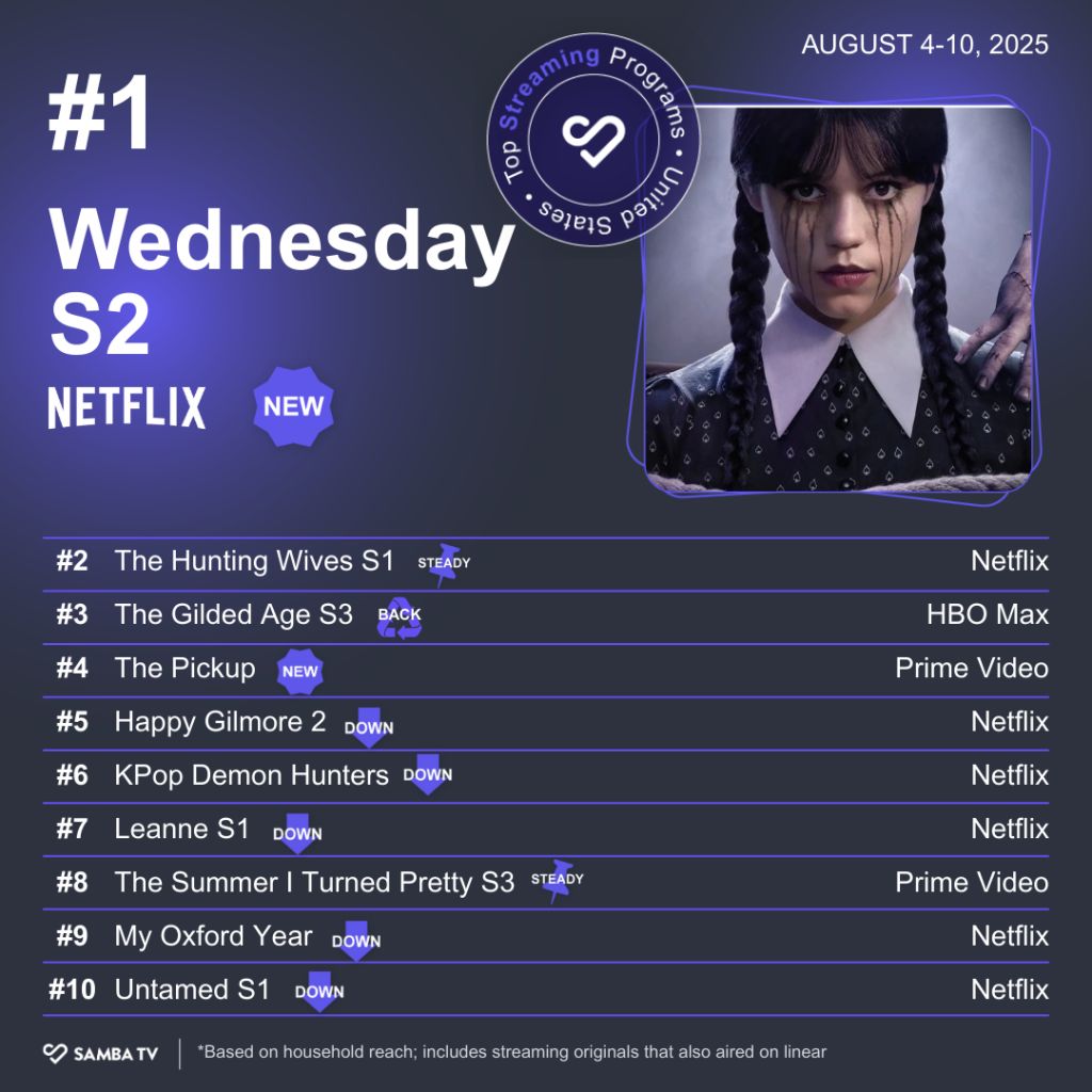 It was the 10th consecutive week a Netflix title has held the top spot. It’s also one of seven Netflix entries this week, making it the second-straight week where the streamer has held seven of our Top 10 spots. With the second half of “Wednesday’s” second season coming on Sept. 3, all signs are pointing to Netflix summer extending past Labor Day.