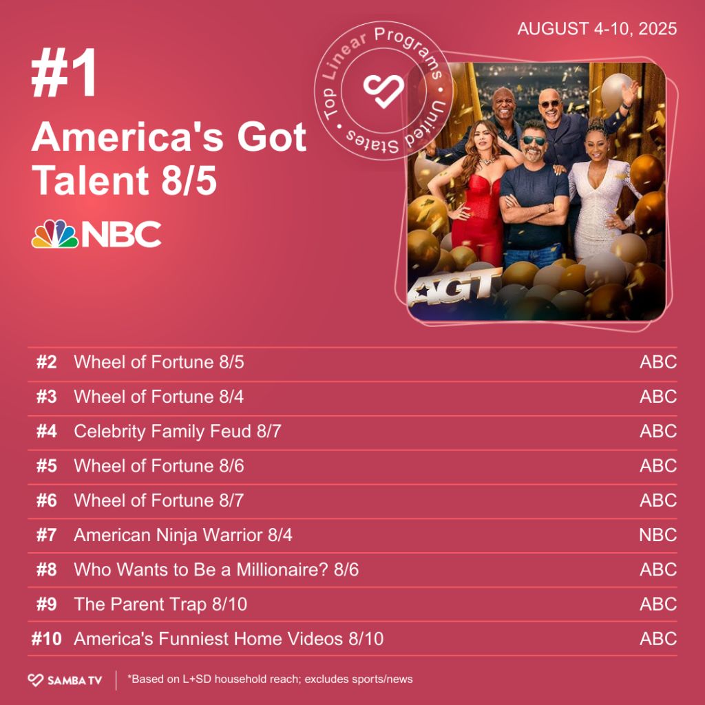Changing the dial to linear, “America’s Got Talent” is tops once again. Amid the normal glut of game shows and competitions, we do get a movie breaking through. ABC aired the 1998 remake of “The Parent Trap” on Sunday, Aug. 10. Perhaps aided by Lindsay Lohan fans stoked for the recent release of “Freakier Friday,” we find the film in ninth this week.