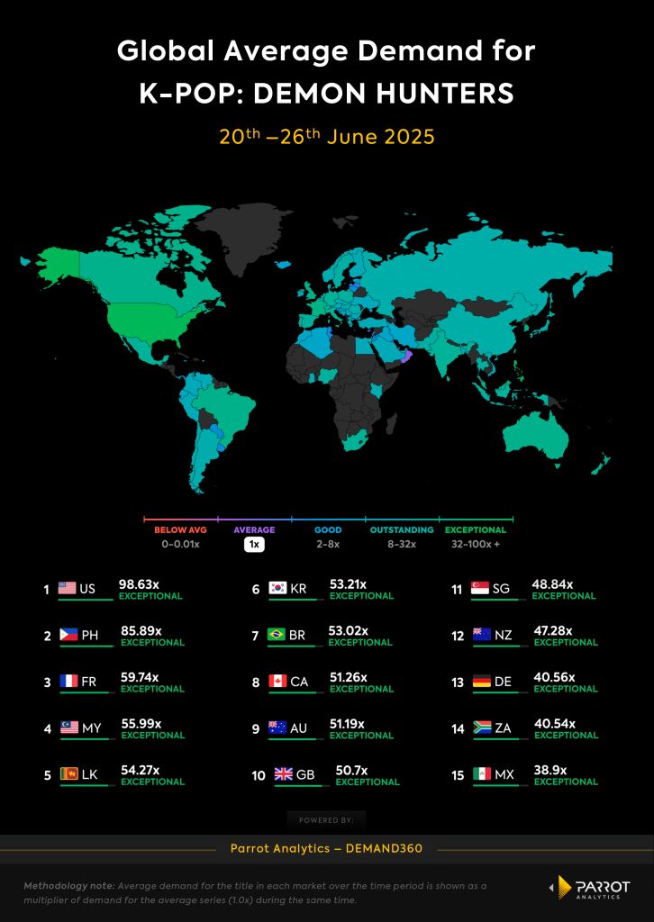 This is no coincidence. Parrot’s data reveals that three of the five most in-demand global music artists in the first half of 2025 are Korean, with their fan bases heavily skewed toward Gen Z. Approximately 60% of audience engagement with these artists comes from Gen Z, making Korean IP a natural fit for cross-platform strategies. During its debut week, “Demon Hunters” reached an exceptional level of demand in 20 countries, outperforming the average title more than 32 times. U.S. led in demand while four Asian markets reached the Top 10, with France and Brazil standing out among Non-Asian and Non-English-language countries.