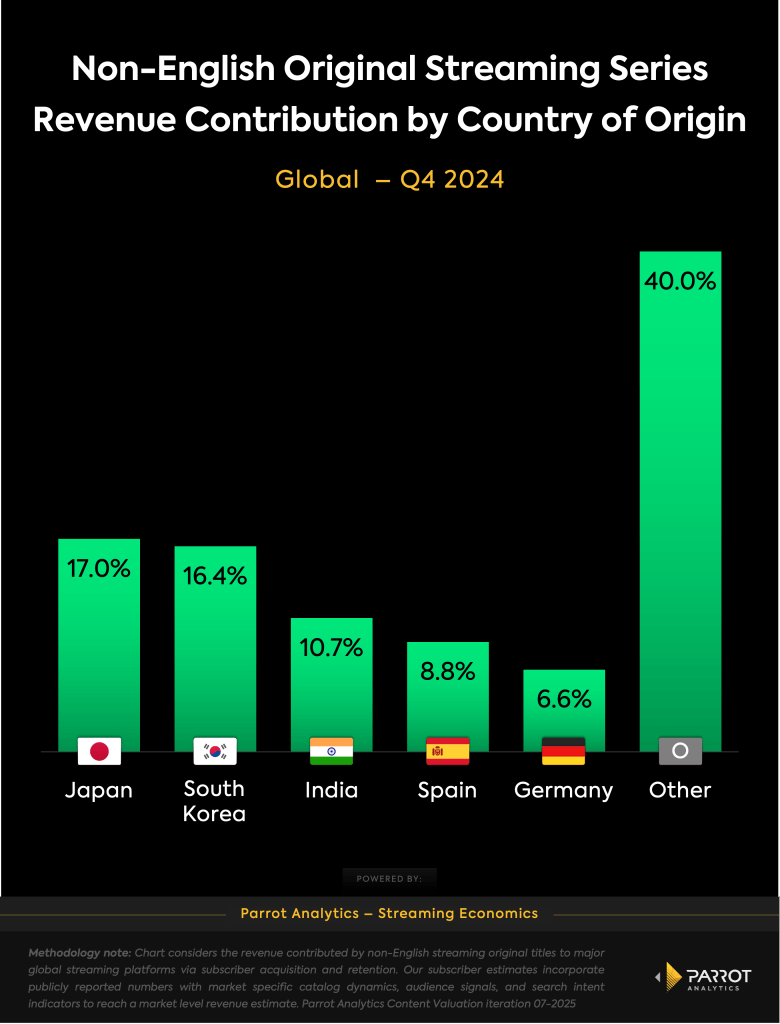 According to demand data from Parrot Analytics, the leader in global media and entertainment analytics, Korean titles were the second-largest driver of global revenue among all non-English-language originals across streaming platforms in the fourth quarter of 2024, trailing only Japanese content. This signals more than just audience appeal, Korean titles are delivering measurable financial returns. As platforms race to capture international markets and Gen Z audiences, Korean IP has proven itself both scalable and lucrative.