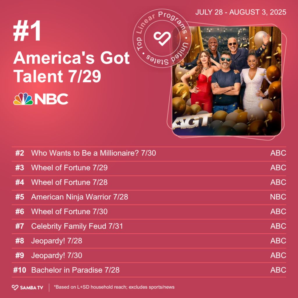 There are no surprises over on linear this week, as “America’s Got Talent” tops the chart yet again.