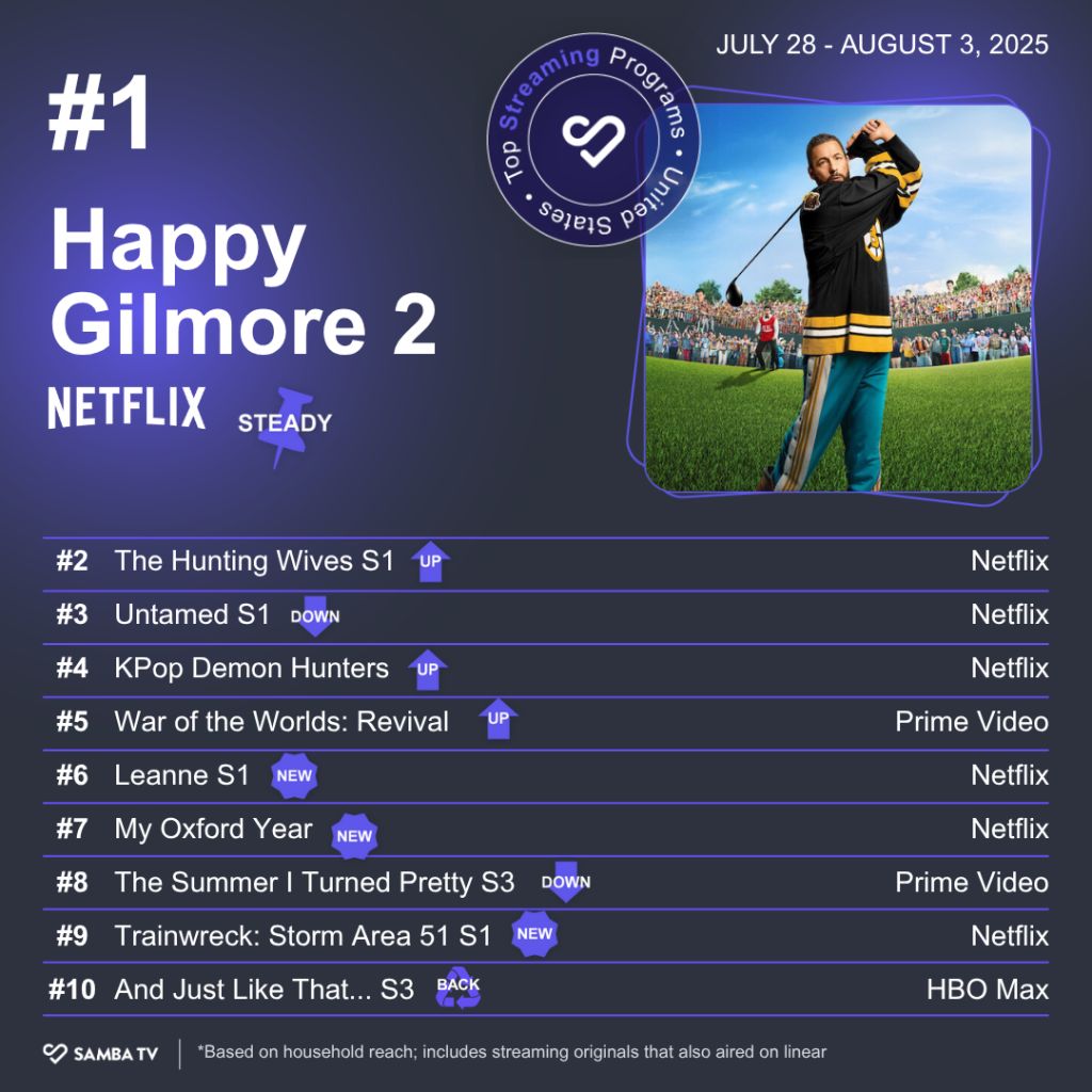 First among the quartet of Netflix titles is “Happy Gilmore 2,” which tops the chart for the second-straight week. The Netflix bean counters are surely happy with the returns on their investment in star Adam Sandler’s Happy Madison Productions following the runaway success of this comedy sequel.