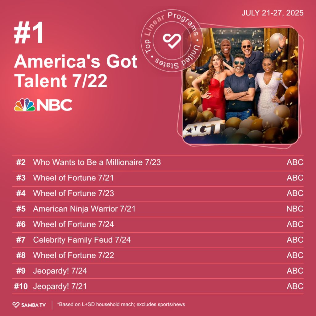 Meanwhile, “America’s Got Talent” continues to top the linear chart, staving off a Top 10 full of game shows.
