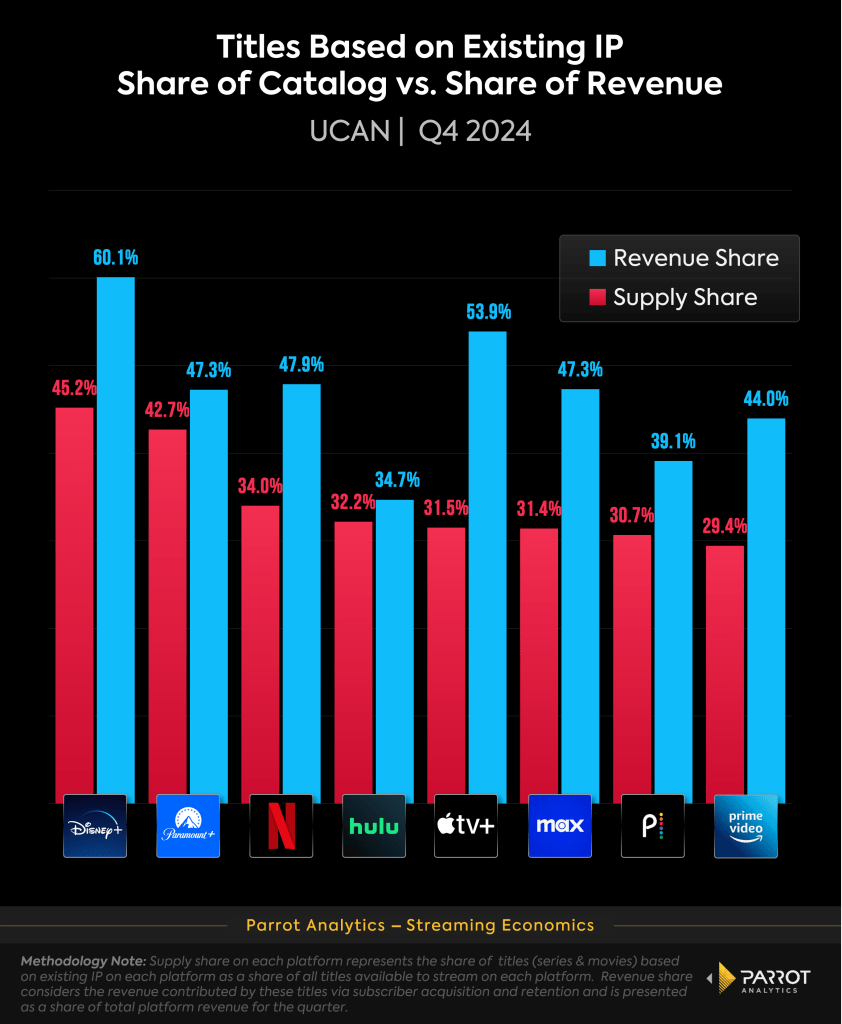 Disney+, with a catalog full of expansive franchises and remakes, was the platform with the largest share of titles based on existing IP. Nearly 50% of shows and movies on the streamer were IP-based. Over 60% of the platform’s subscriber revenue came from these titles, underscoring the importance of this type of content to Disney’s business model.