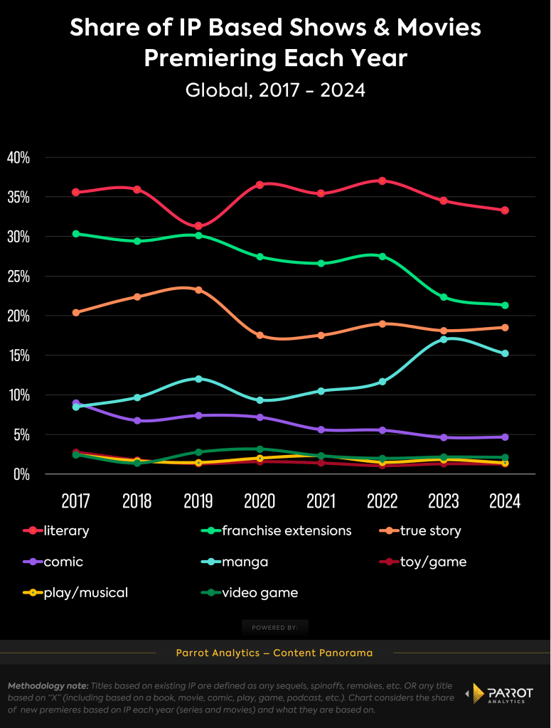 The “franchise extension” category, which encompasses things like sequels or spinoffs as well as remakes, accounts for the second-largest share of IP-based titles premiering in recent years. However, the relative importance of this type of adaptation has been declining. In 2017, these titles made up 30% of new premieres based on existing IP, but this has fallen to just over 20% in 2024.