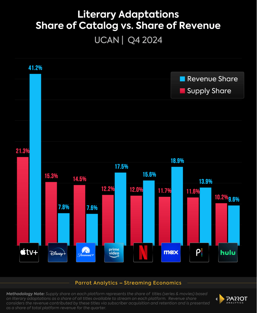 Literary adaptations did not overperform across all platforms and made up a smaller share of revenue than their share of catalog on Disney+, Paramount+ and Hulu. Not all platforms have been able to make these types of adaptations pay off, and none have had the success that Apple TV+ has. The platform is carving out a space for itself as the premier destination for audiences looking for book adaptations.