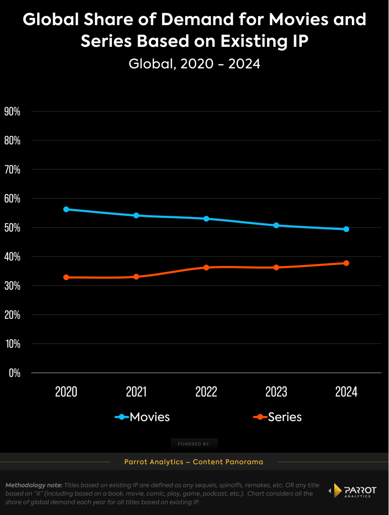 Parrot Analytics data shows that the share of demand for truly original, non-IP-based movies has been growing since 2020
