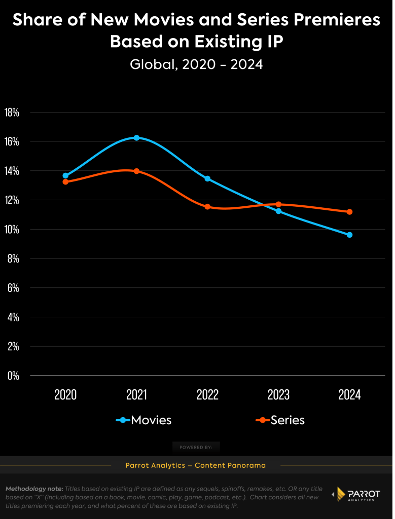 At first glance, this decline might seem surprising, especially given the overwhelming presence of spinoffs, reboots and adaptations in the entertainment landscape. However, the numbers suggest that while IP-based titles still dominate headlines, a wealth of truly original content is being released each year, with many new titles not tied to existing franchises or based on existing content.