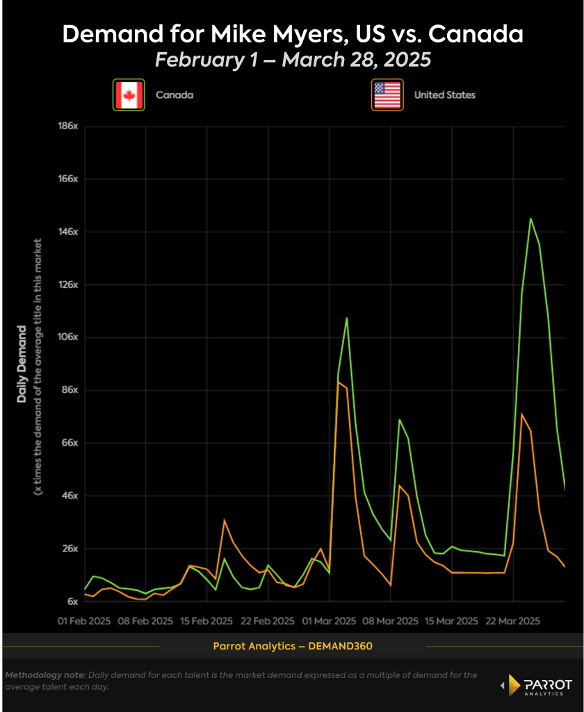Mike Myers saw his highest demand in Canada on March 24, not after an “SNL” episode but following a political ad for Canada’s Liberal Party that he released with Mark Carney. Both Myers and the Canadian PM understand how American late night is an effective platform for raising their profile – even in Canada.