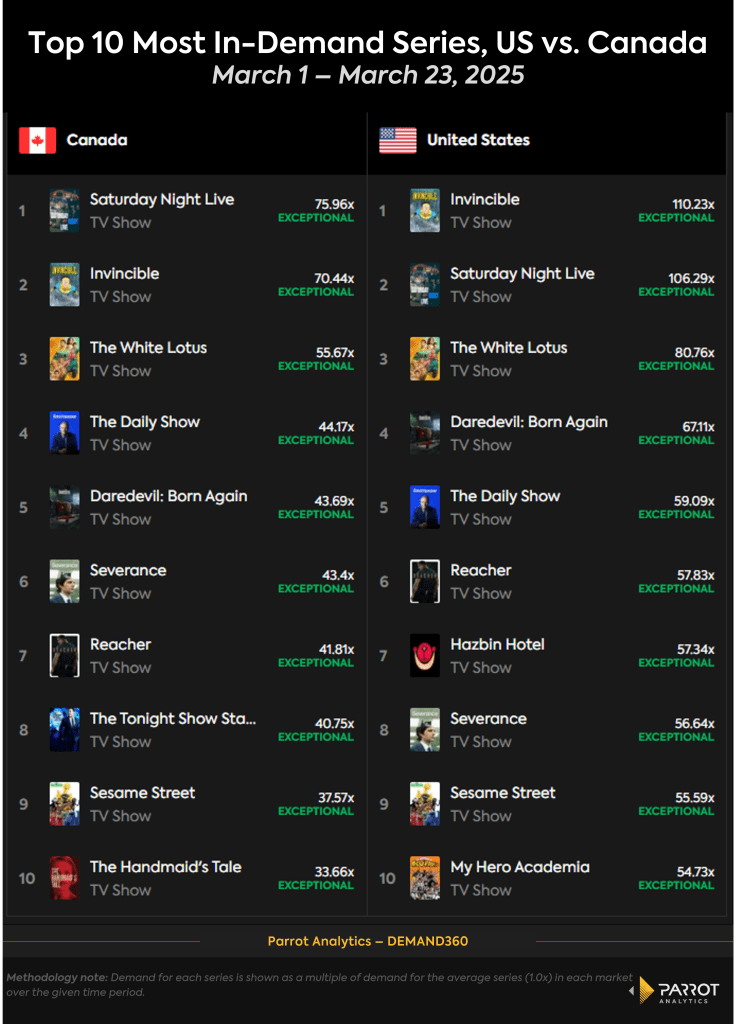 U.S. variety shows (“Saturday Night Live,” “The Daily Show,” and “The Tonight Show Starring Jimmy Fallon”) accounted for three of the ten most in-demand shows in Canada in March. Tellingly, all of these have ranked higher among shows in Canada than in their U.S. home market.