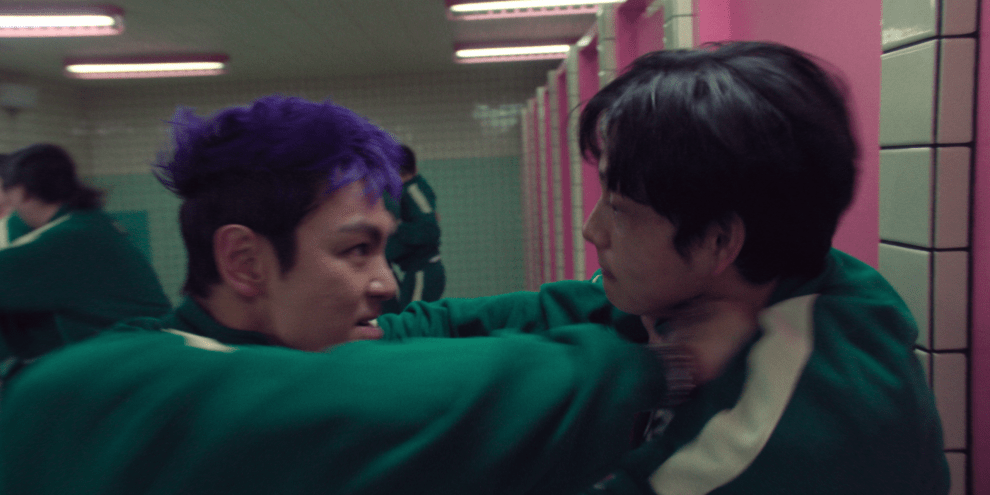 In one scene, In-ho, aka Front Man, an overseer of the competition masquerading as a player, confronts the purple-haired braggart Thanos (Choi Seung-hyun) and his sidekick Nam-gyu (Roh Jae-won) as they’re pummeling their nemesis Myung-gi (Yim Si-wan). In a swift, seemingly effortless move, In-ho throws Thanos to the ground and starts choking him with one hand while raising the other in a tight fist ready to punch.