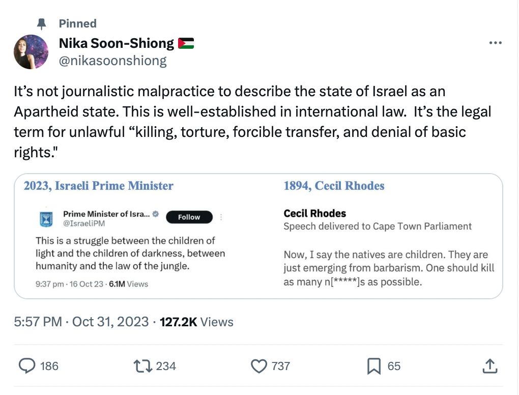 But Merida did not inform Soon-Shiong until after the decision was implemented. The billionaire and his daughter, Nika, both made clear they did not agree, according to two individuals. Nika Soon-Shiong, 30, is vocally anti-Israel. Her X social feed has a Palestinian flag in her bio, and a pinned tweet comparing Israeli Prime Minister Benjamin Netanyahu with Cecil Rhodes, the racist founder of Rhodesia. (Nika Soon-Shiong did not respond to requests for comment made through LinkedIn and her charity, Fund For Guaranteed Income.)