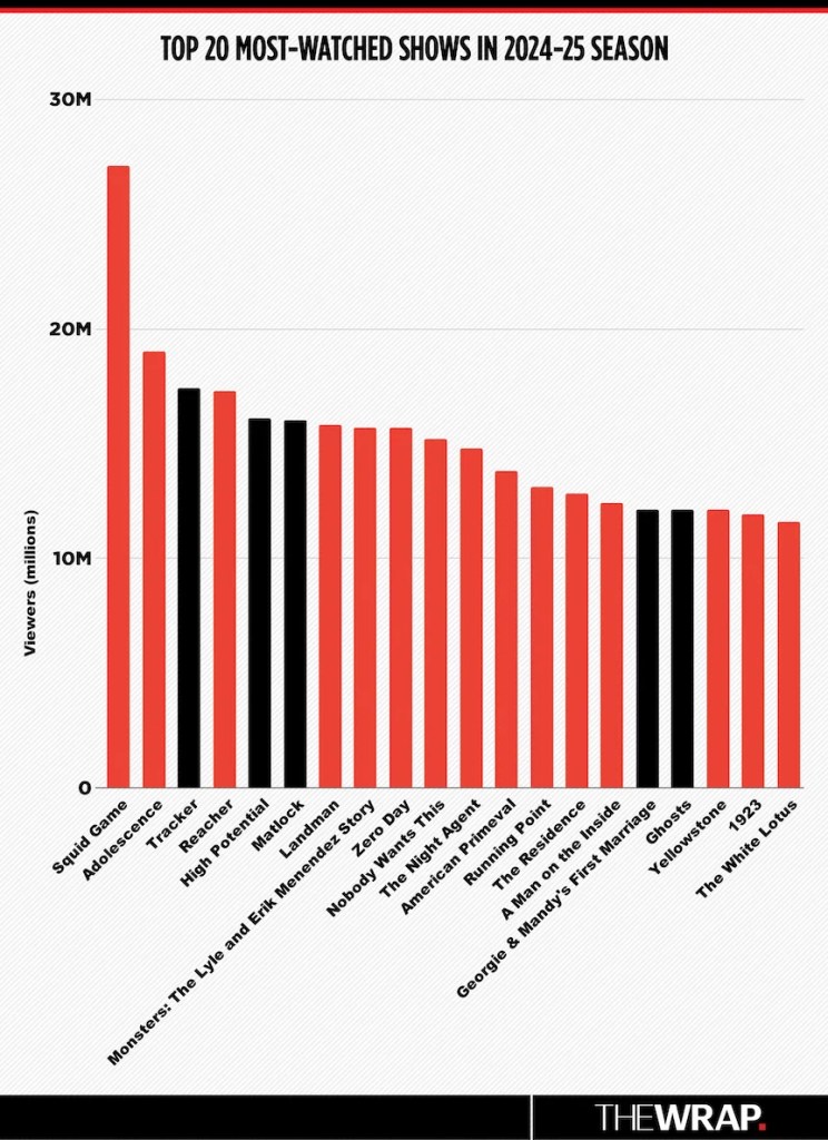 While Prime Video’s “Reacher” (17.3 million) and Paramount+’s “Landman” (15.8 million) snuck into the top 10, Netflix took the No. 8-15 spots with “Monsters: The Lyle and Erik Menendez Story,” “Zero Day” and “Nobody Wants This” — all of which scored over 15 million viewers — as well as “The Night Agent,” “American Primeval,” “Running Point,” “The Residence” and “A Man on the Inside,” which closed out Netflix’s reign with 12.4 million viewers.